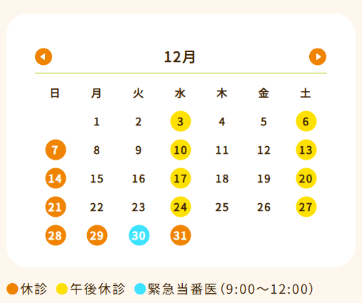 12/28(日)~1/4(日)…休診※12/30(火)のみ緊急当番医のため、9:00~12:00の間診療いたします