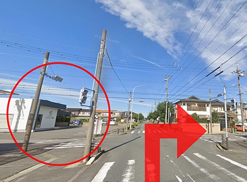 「すみれファミリー歯科」さんが左手にある交差点に出ます。そこを右折します。
